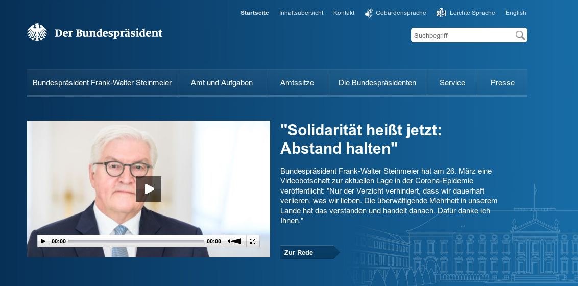 Bundespräsident Frank-Walter Steinmeier hat am 26. März eine Videobotschaft zur aktuellen Lage in der Corona-Epidemie veröffentlicht.
